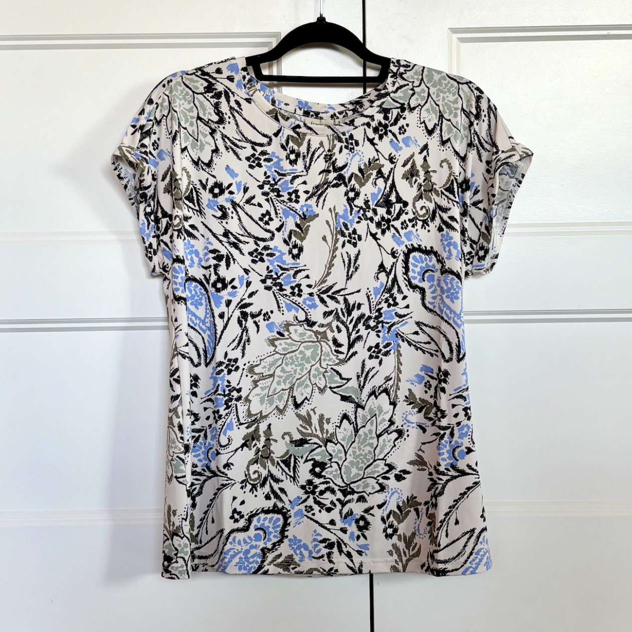 Ladies loose-fit tee by Fransa. Features a modest rounded neckline and cap sleeve with turned-back hem. 100% polyester