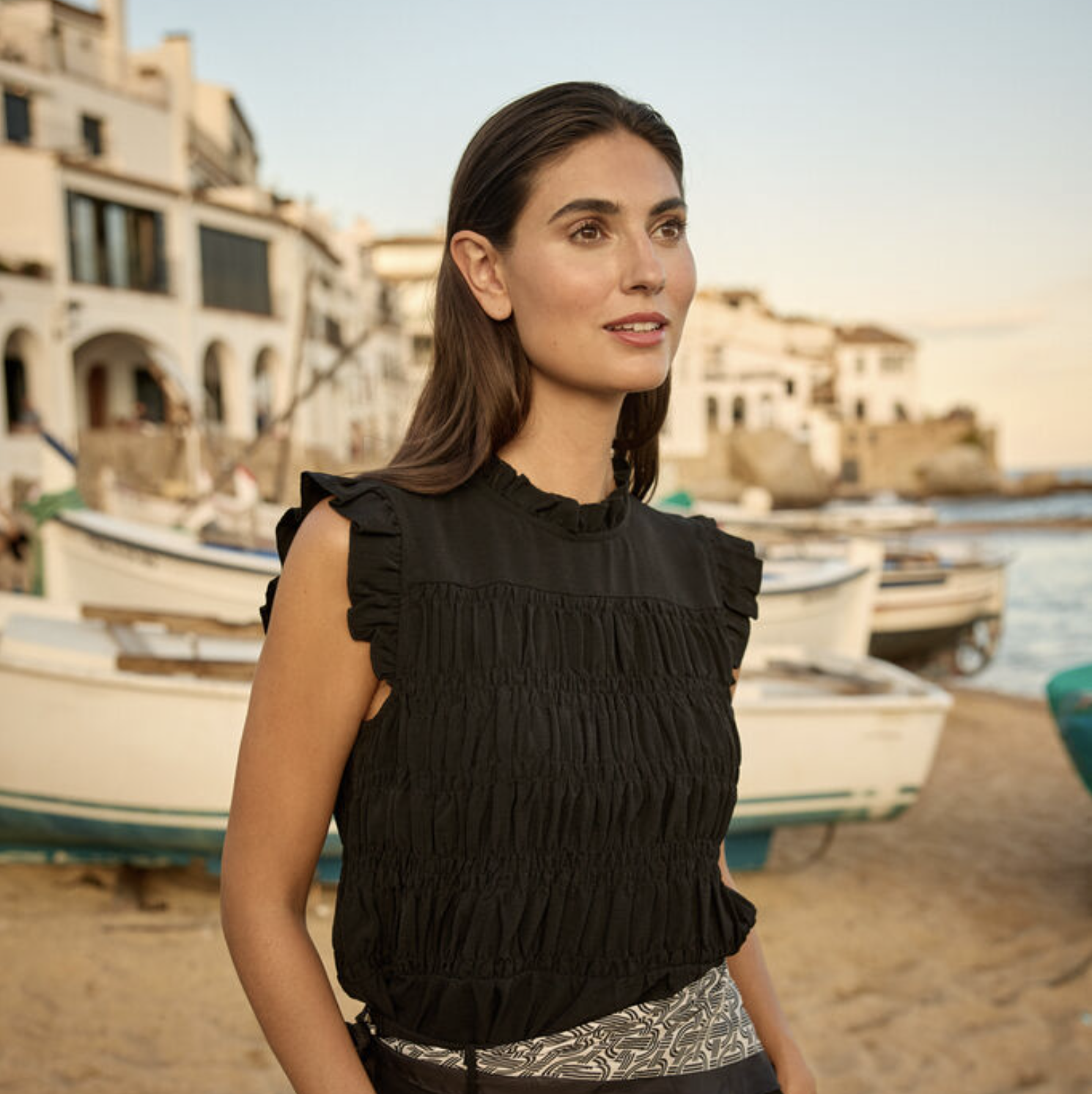 Cath is a beautiful blouse-top crafted from 100% polyester. It features a high collar with delicate ruffle details, short sleeves,...