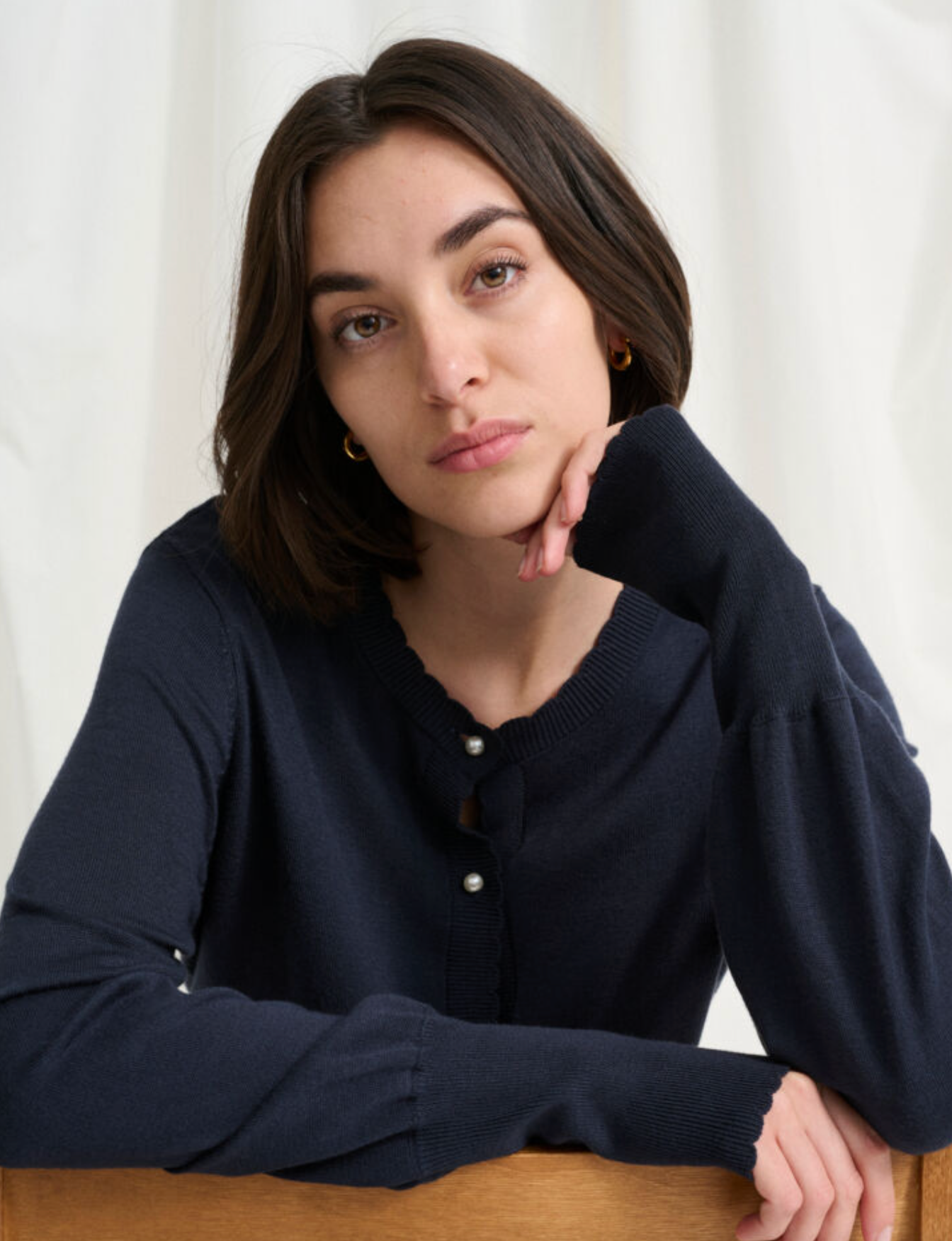 This classic cardigan by Culture features an elongated cuff, scalloped trim at the cuffs and neckline and an elegant pearl-button...