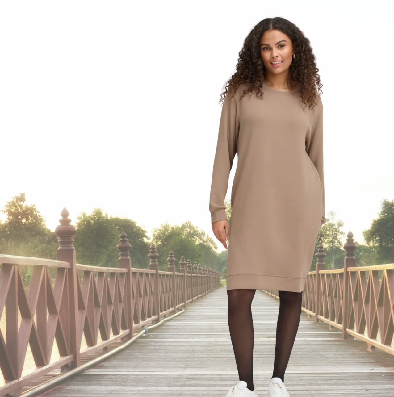 Super-soft knee-length jersey dress. Features 2 deep side pockets. Very roomy fit - you can comfortably size down if you're between sizes. 53% Modal, 41% Polyester, 6% Elastane. By Fransa.