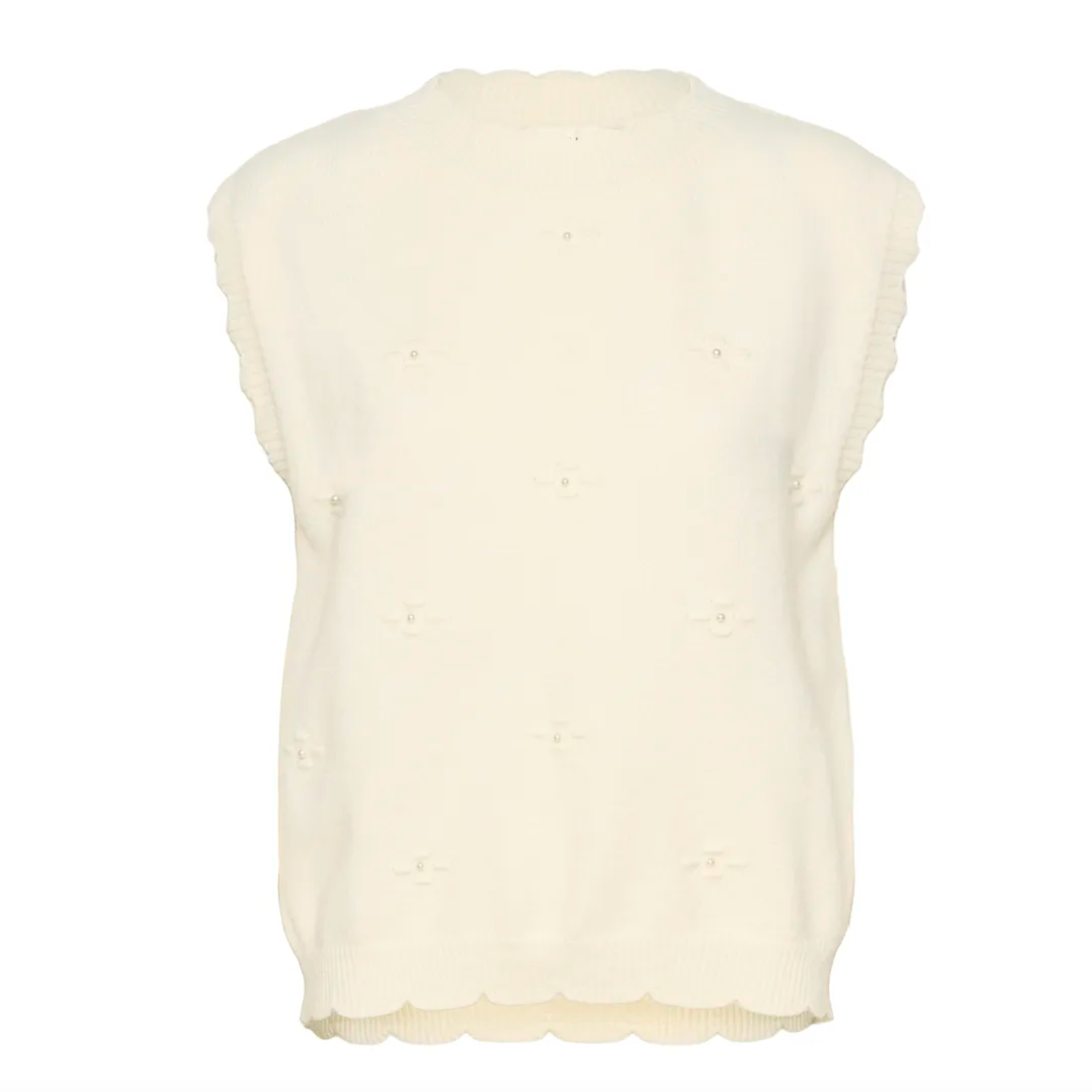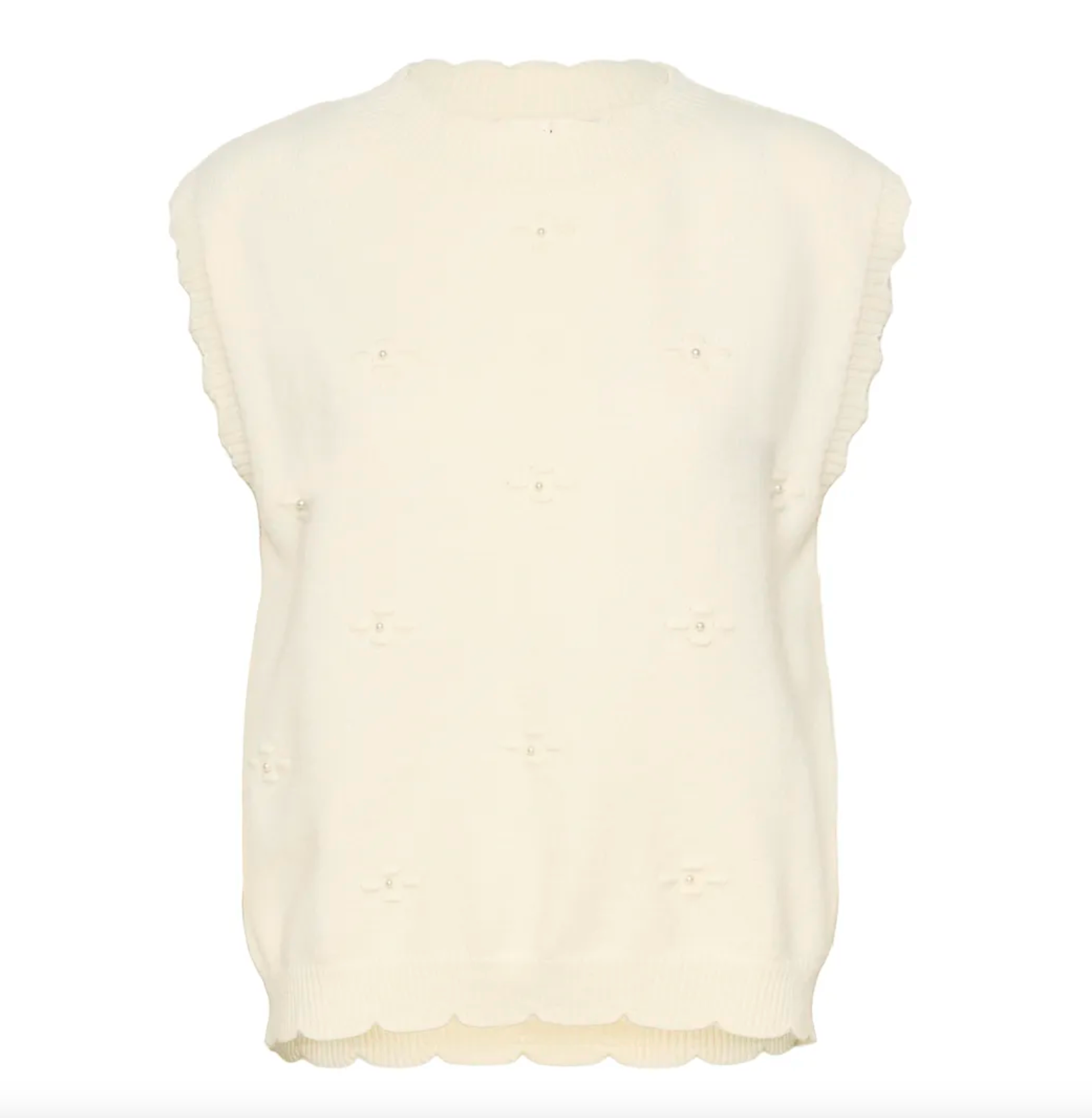 Slip on a bit of Danish romance with the Avie knit pullover! Pretty scallops on the shoulders and hemline together...
